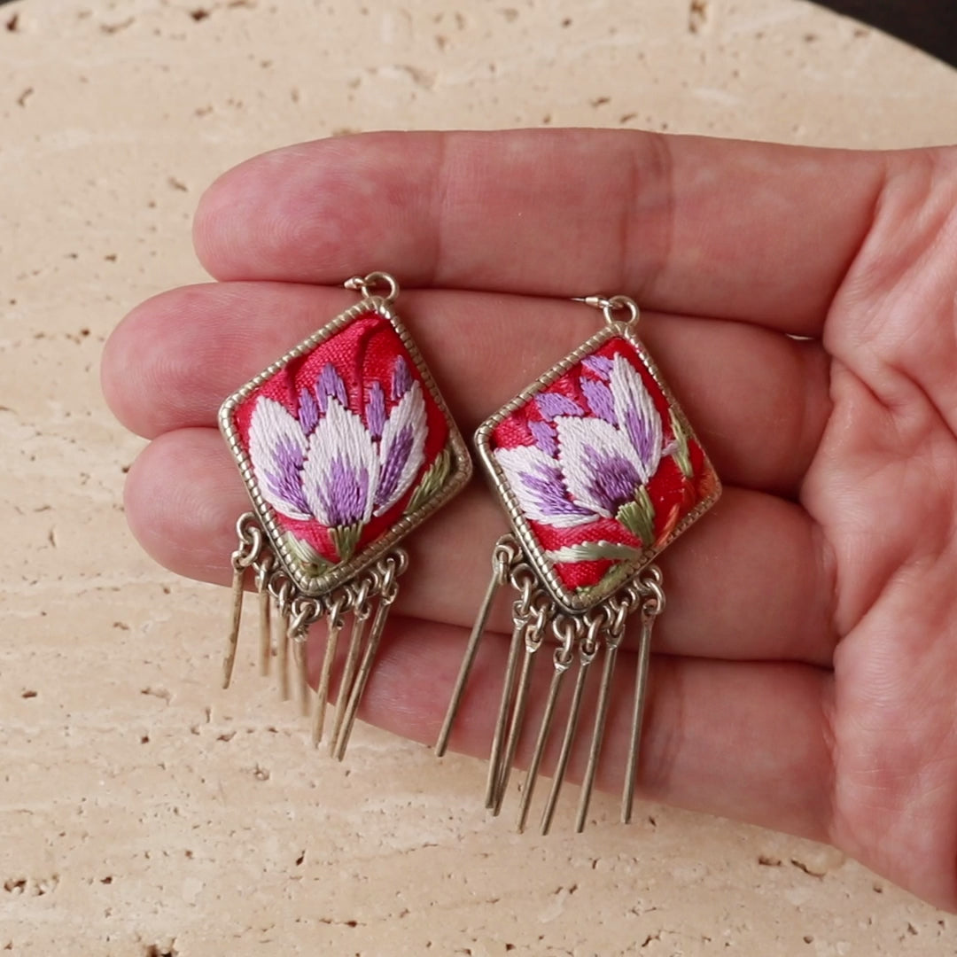 These colorful embroidered Blink & Bliss Tassel Earrings create a mesmerizing cascade of hopes and blessings to evoke a sense of calming beauty.