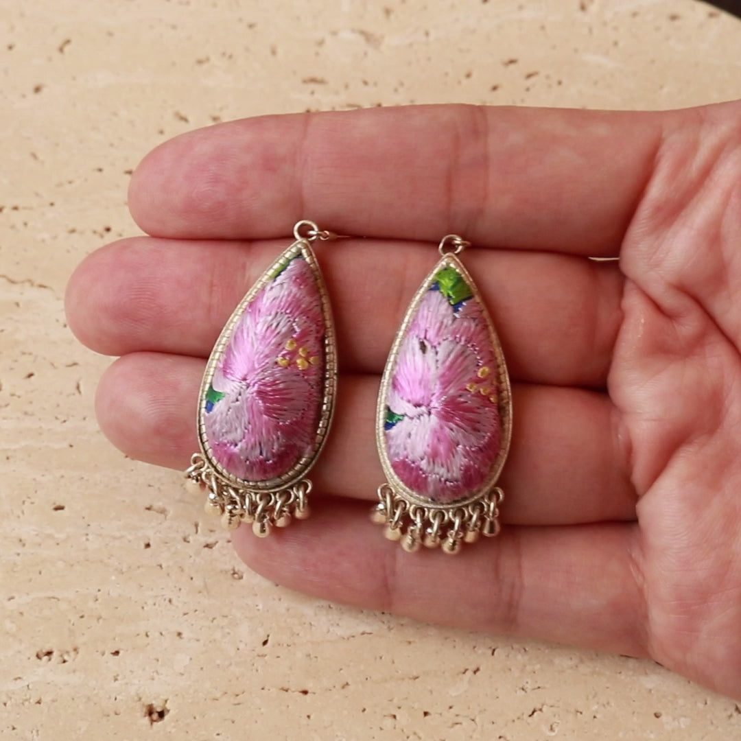 Dangling delicately, these floral hand-embroidered earrings shaped as teardrops embody moments of tranquility and grace. A wearable reminder of the serene beauty found in life's poignant tears.