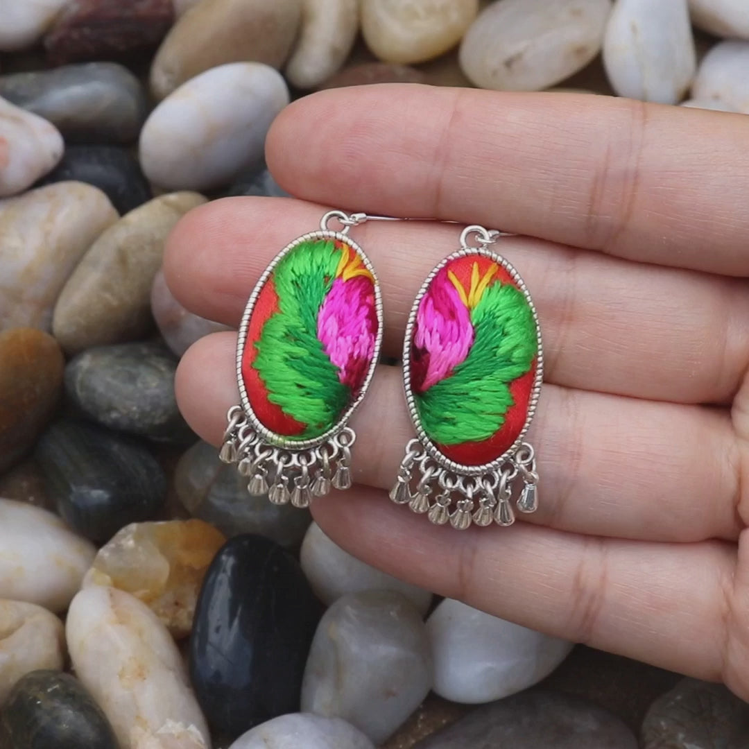Dangling delicately, these red floral hand-embroidered earrings shaped as teardrops embody moments of tranquility and grace. A wearable reminder of the serene beauty found in life's poignant tears.